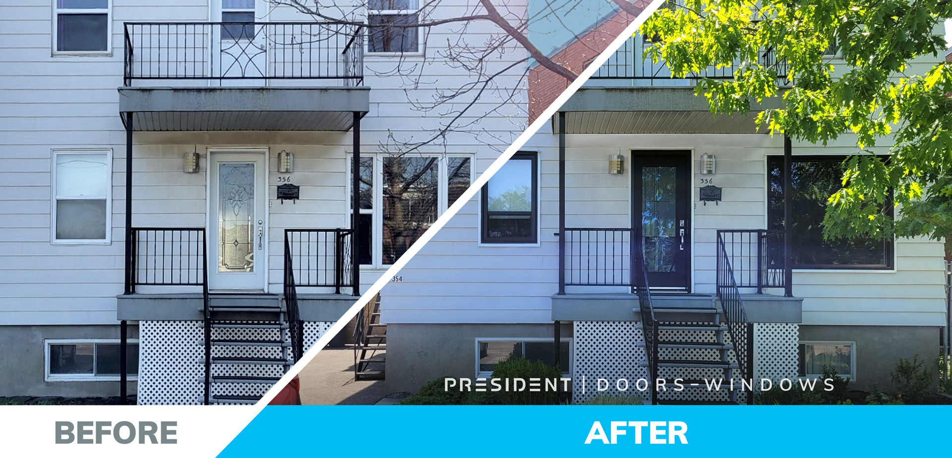 Professional advice from PRESIDENT led Guylaine to choose hybrid configuration windows made from PVC and aluminum, with a white frame inside the house and a black one outside. She opted for a single-hung model in a 1/3–2/3 configuration. This change added a modern effect to Guylaine’s duplex without clashing with the property’s original style. And her new front door with a Nobel stained glass served as a simple but elegant final touch to the decor.