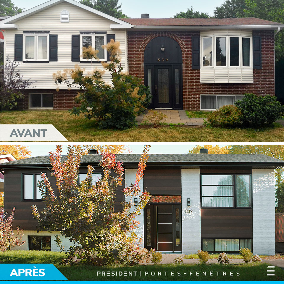 Sylvie de Sainte-Julie désirait modifier complètement l’aspect de sa maison, mais également en améliorer l’efficacité énergétique en remplaçant l’ensemble de la fenestration. La fenêtre arquée en façade ainsi que la porte d’entrée étaient les principales sources de perte d’énergie. Ayant en tête de repeindre en blanc la brique en façade, la configuration actuelle de la fenestration ne se prêtait plus à l’allure contemporaine désirée. La propriétaire a saisi l’occasion d’actualiser l’allure de sa propriété.